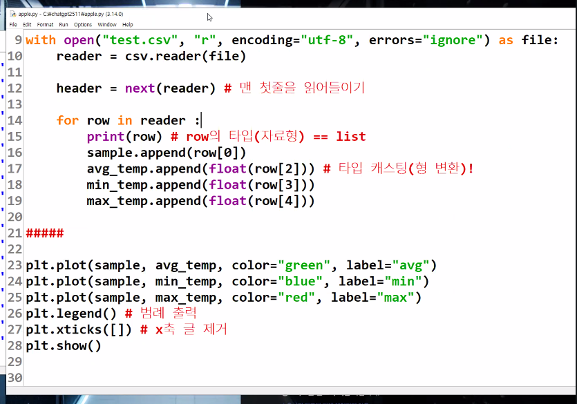 | 파이썬으로 CSV 파일 불러와 최고 기온 찾기 (0) | 2026.03.13 |